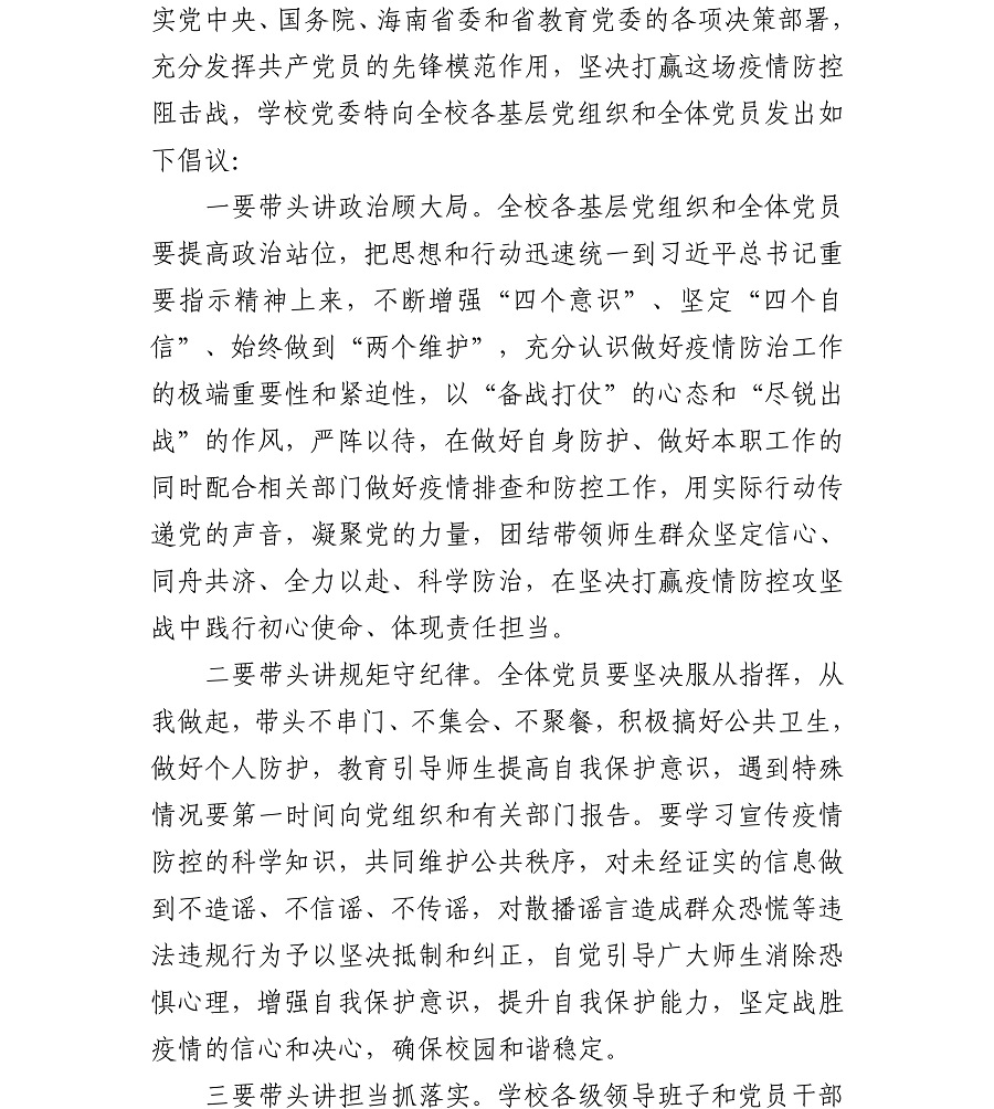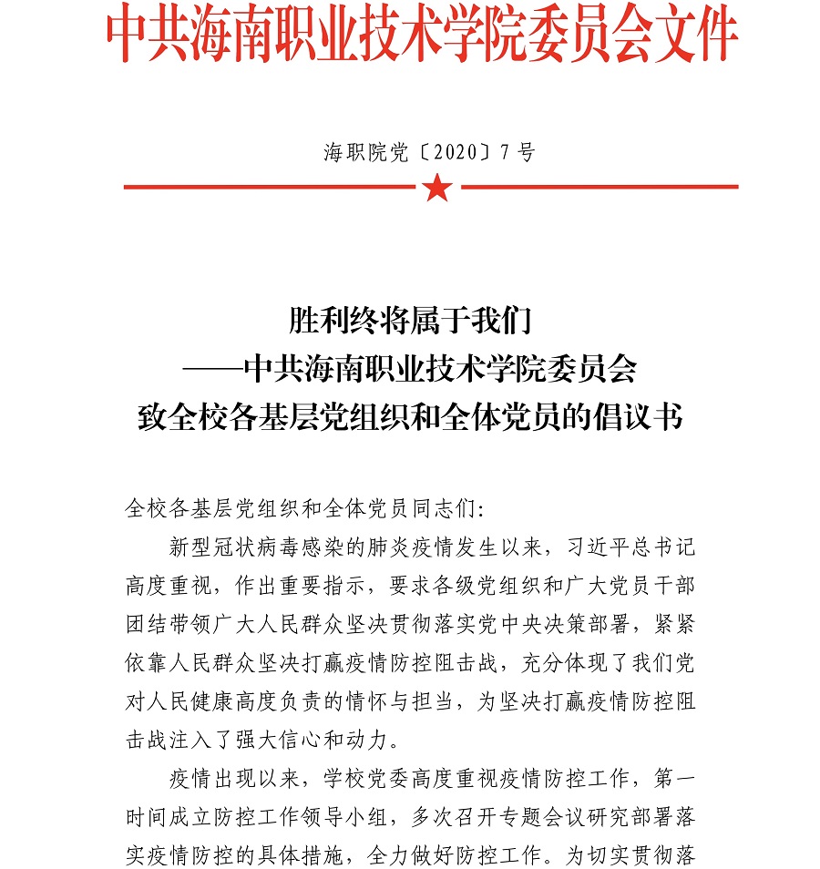 勝利終將屬于我們——中共海南職業(yè)技術(shù)學(xué)院委員會致全校各基層黨組織和全體黨員的倡議書