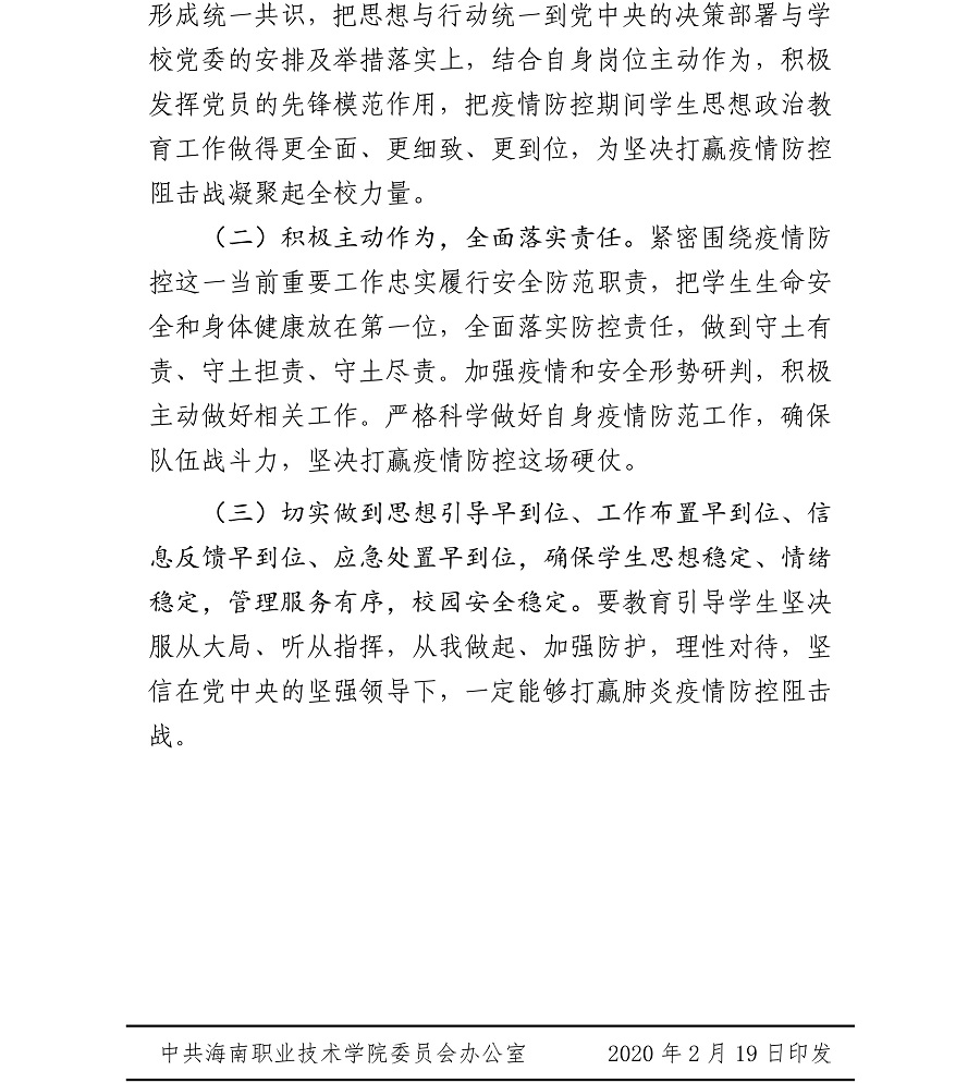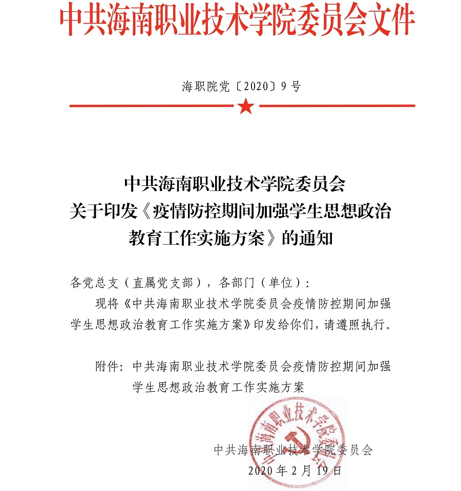 中共海南職業(yè)技術(shù)學(xué)院委員會(huì)關(guān)于印發(fā)《疫情防控期間加強(qiáng)學(xué)生思想政治教育工作實(shí)施方案》的通知