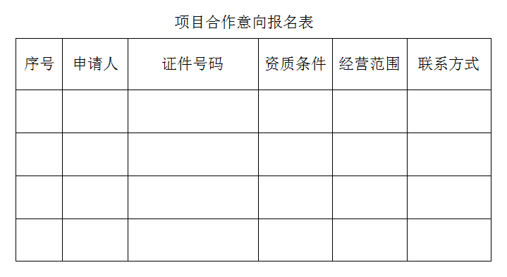 5.相關(guān)條件適合的、有意向的,可先到本公司報(bào)名填表,經(jīng)出標(biāo)方考證、核查后挑選合適人選參加合作項(xiàng)目競(jìng)標(biāo)。(競(jìng)標(biāo)按照公司的相關(guān)程序?qū)嵤?,具體情況另行通知)。