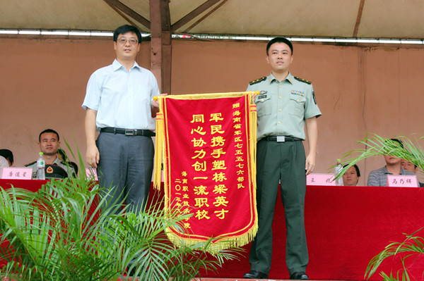王安興代校長(zhǎng)向軍訓(xùn)部隊(duì)贈(zèng)送錦旗