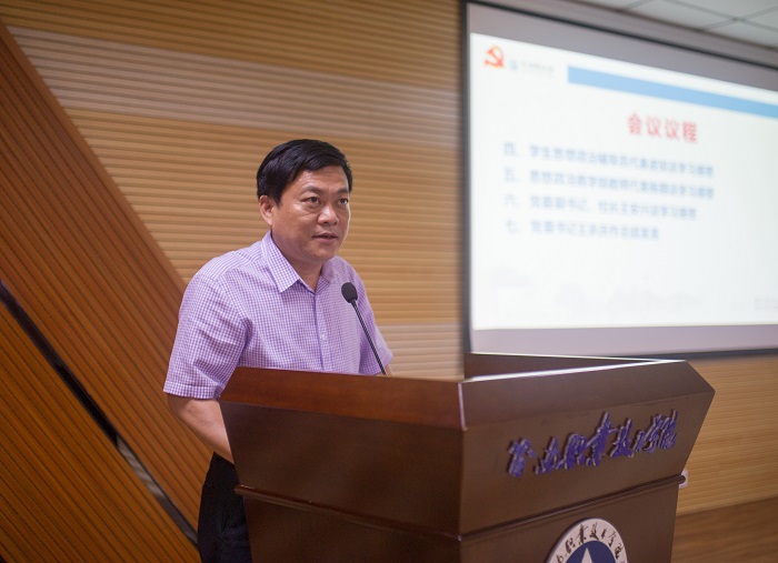 校領(lǐng)導(dǎo)黃銀珍、林方賀、符興干、吳肖淮和全校中層領(lǐng)導(dǎo)干部、全體思政理論課教師、學(xué)生輔導(dǎo)員、黨群與教務(wù)相關(guān)部門(mén)工作人員參加了會(huì)議。