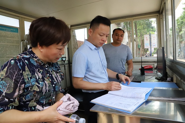 黨委副書記周炳才查看門崗值班記錄表(黨委宣傳部黃炳蔚攝影)