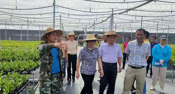何西慶一行在蘭花種植基地調(diào)研(扶貧辦供圖)