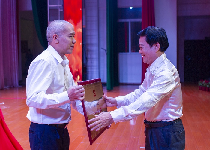 林方賀為大合唱比賽優(yōu)秀獎(jiǎng)獲獎(jiǎng)單位頒獎(jiǎng)(圖書館 梁平攝影)