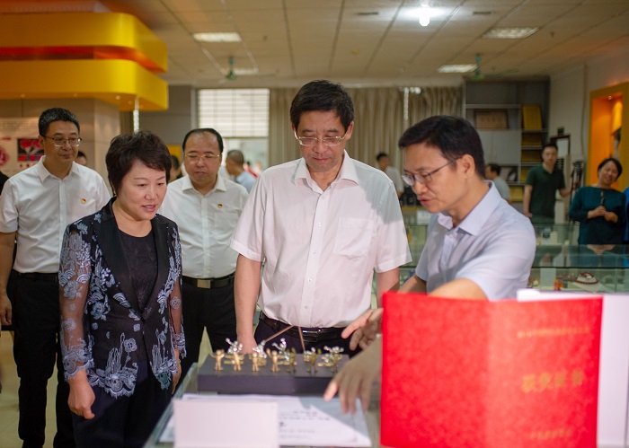 彭金輝參觀我校師生2018年中國旅游商品大賽金獎作品(黨委宣傳部供圖)