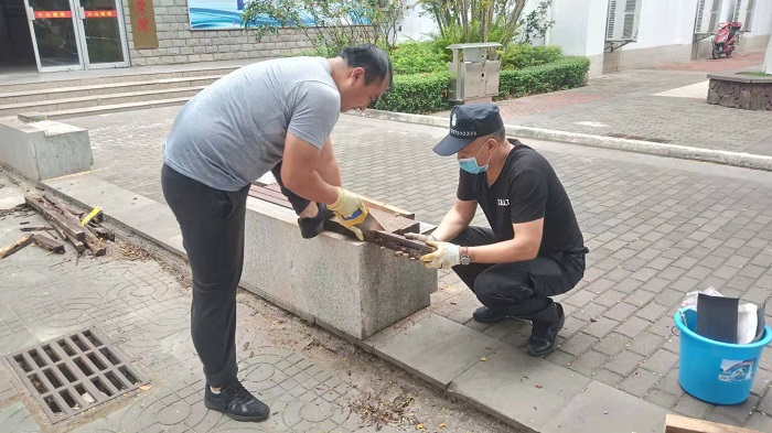 李國(guó)建和保衛(wèi)科隊(duì)員對(duì)凳面損壞的石凳進(jìn)行修復(fù)(后勤保衛(wèi)處供圖)