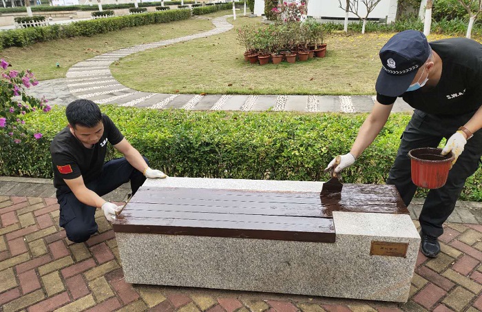 保衛(wèi)科隊(duì)員對(duì)凳面脫漆的石凳進(jìn)行刷漆保養(yǎng)(后勤保衛(wèi)處供圖)