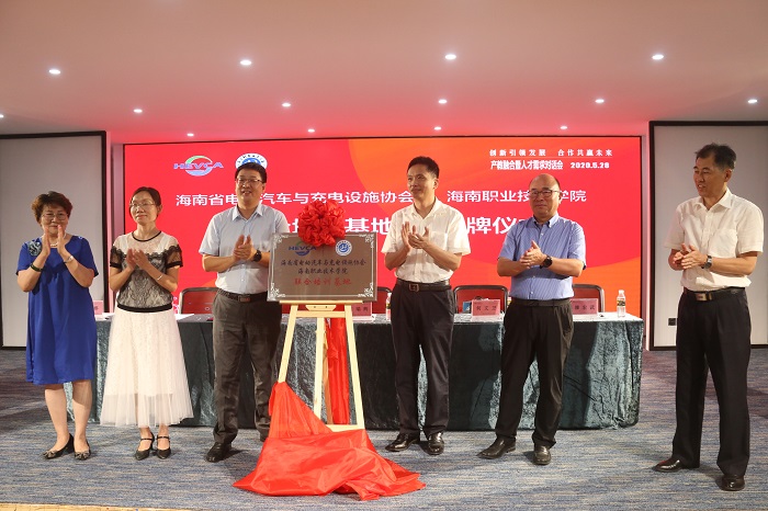 雙方共同為海南省電動(dòng)汽車與充電設(shè)施協(xié)會(huì)、海南職業(yè)技術(shù)學(xué)院聯(lián)合培訓(xùn)基地揭牌(黨委宣傳部供圖)