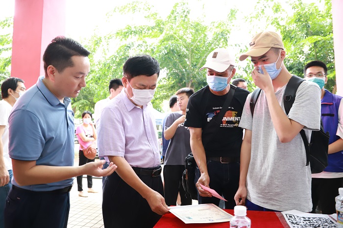 10月12日上午,學校黨委書記王承慶、校長王安興心系報到新生,逐一走訪新生接待大本營、軍訓服裝發(fā)放處、學生宿舍和學生食堂等場所,仔細查看迎新工作,慰問迎新工作人員,與報到新生和家長親切交談。