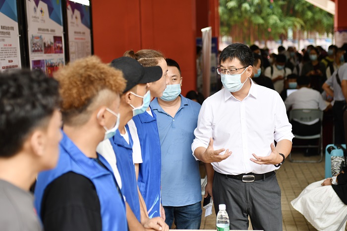 王安興與迎新志愿者交談(黨委宣傳部供圖)