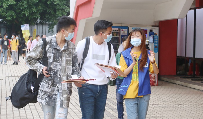 新生報到期間,學校在海口火車站、美蘭機場、新海港、火車東站設立接站點,各站點配備雨傘、雨衣等物資,做好應急準備。校車為新生提供接送服務,志愿者為新生提供全程服務。