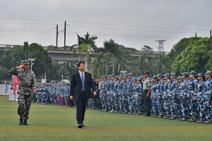 王安興代表學(xué)校黨政領(lǐng)導(dǎo)班子向承擔(dān)新生軍訓(xùn)訓(xùn)練任務(wù)教官、學(xué)生帶訓(xùn)教官和軍訓(xùn)工作人員表示衷心的感謝,向來自全國26個省市自治區(qū)、30個民族、4200多名新生表示熱烈的歡迎。他表示,在海南自由貿(mào)易港建設(shè)的開局之年、海南職業(yè)技術(shù)學(xué)院成立20周年這個富有歷史意義的時刻,在你們?nèi)松飞嫌忠粋€新的起點(diǎn),希望同學(xué)們用三年的時光勤奮學(xué)習(xí)并體會職業(yè)教育精神,努力培養(yǎng)嚴(yán)謹(jǐn)細(xì)致的做事風(fēng)格、精益求精的“工匠精神”;用三年的時光發(fā)現(xiàn)自己并探尋時代發(fā)展的機(jī)遇,相信奮斗的力量,擁有向上的信心,不怕經(jīng)受歷練,主動自覺地追求充實、廣闊和更有意義的人生;用一生的時光勤奮奔跑并樹立服務(wù)祖國的理念,一如既往地保持對知識的熱愛,保持勤奮踏實的品格,勇做走在時代前面的奮進(jìn)者、開拓者、奉獻(xiàn)者,努力成為祖國建設(shè)的有用之才、棟梁之材。