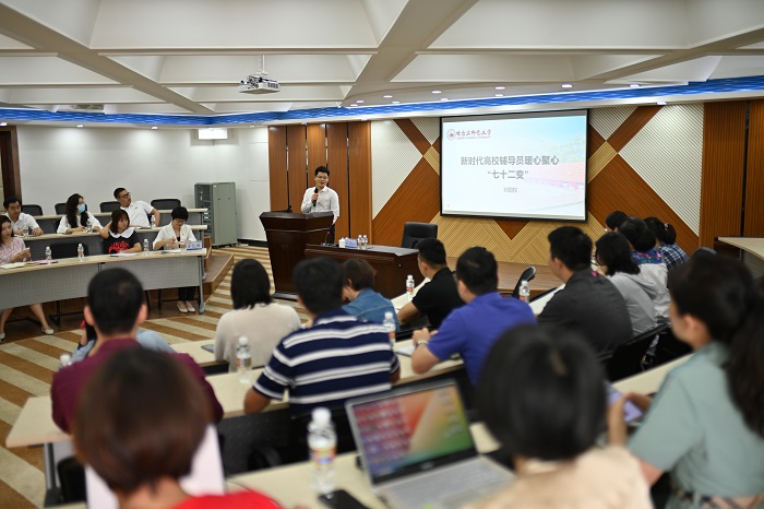 劉國權(quán)在培訓(xùn)中闡述了“七十二變”、“3456育人法”工作理念,從如何組建團隊、如何整合資源支持、如何充分利用新媒體平臺發(fā)聲等方面分享了輔導(dǎo)員工作室運營經(jīng)驗。他指出新時代高質(zhì)素專業(yè)化創(chuàng)新型高校輔導(dǎo)員應(yīng)當(dāng)守住“底線”追求“上限”、要做“眼前人”和“身邊人”、要“遵循規(guī)律、潛移默化”做好學(xué)生成長成才的人生導(dǎo)師和健康生活的知心朋友,要在實踐中提高輔導(dǎo)員隊伍專業(yè)化、職業(yè)化水平。