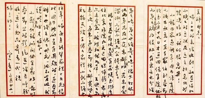 在給兒媳的家書中,寫信稱呼兒媳為王婷同志,信件結(jié)尾落款處是云逸,而不用父親、家公之類的輩分落款。從這可以看出來,張云逸將軍是把兒媳當(dāng)作平等的革命同志來對待。他細(xì)話家常,關(guān)切夫人的身體狀況,操持大小家事,安頓身邊家人,讓遠(yuǎn)方的子女不必掛心;他欣喜于小孫女的安好、幼子成長的樂趣、孩子們相處的和諧,仿佛我們身邊最親近慈祥的爺爺;他尊重又關(guān)懷親家王姥姥的情況,從未因傳統(tǒng)門第觀念和兩家的巨大差距而生出一絲鄙夷,反而時常探望、誠懇相助,充分肯定兒媳對娘家的幫扶,從始至終盡顯與人的尊重、與家人的溫情,讓人感動的同時,不由心生敬佩。