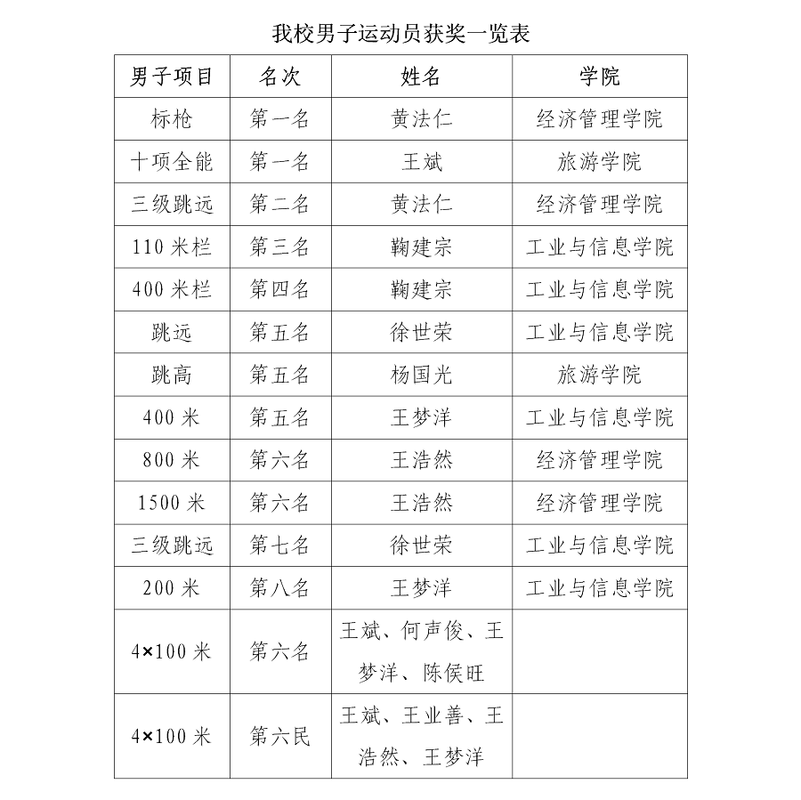 本次比賽由海南省教育廳,海南省旅游和文化廣電體育廳主辦,來(lái)自全省大中專(zhuān)院校的28支隊(duì)伍,共603名運(yùn)動(dòng)健兒展開(kāi)激烈角逐。我校健兒始終保持頑強(qiáng)拼搏的精神、堅(jiān)韌不拔的意志和永爭(zhēng)第一的信心,在男子十項(xiàng)全能、男子三級(jí)跳遠(yuǎn)、女子跳遠(yuǎn)、女子100米欄、女子800米、1500米、女子3000米等項(xiàng)目上均取得第一名的好成績(jī)。