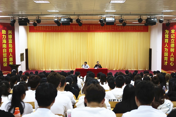 3月29日晚,海職院黨校“能力提升建設(shè)”黨課大比武活動(dòng)暨第三十七期入黨積極分子培訓(xùn)班開(kāi)班典禮在學(xué)術(shù)報(bào)告廳舉行。學(xué)校黨委書(shū)記王承慶出席并給391名入黨積極分子宣講黨的十九屆六中全會(huì)精神。