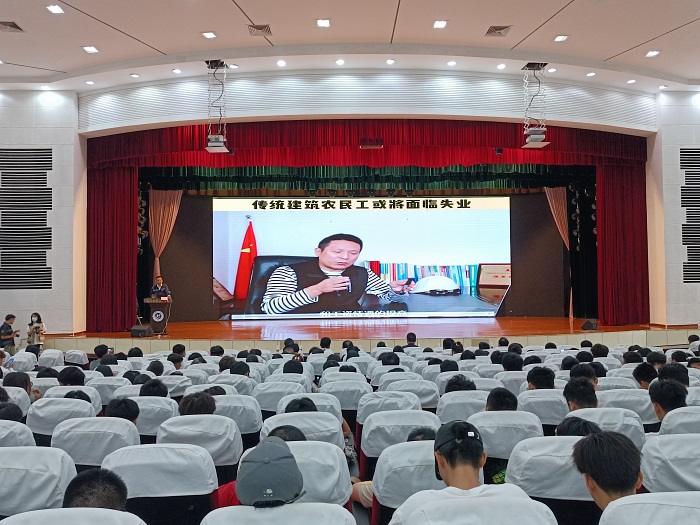 尹飛主要圍繞建筑產(chǎn)業(yè)工人發(fā)展的時(shí)代背景、新時(shí)代建筑產(chǎn)業(yè)工人的基本特征、新時(shí)代建筑產(chǎn)業(yè)工人隊(duì)伍建設(shè)的經(jīng)驗(yàn)分享、真格新時(shí)代機(jī)電產(chǎn)業(yè)工人戰(zhàn)略發(fā)展新布局及深化校企合作等方面進(jìn)行了詳細(xì)的闡述,讓同學(xué)們對(duì)新時(shí)代的產(chǎn)業(yè)工人有了深入的了解。他秉承“持續(xù)提高建筑產(chǎn)業(yè)工人幸福感,讓建筑產(chǎn)業(yè)工人有尊嚴(yán)、有幸福、有保障的工作和生活”的經(jīng)營(yíng)宗旨,以“弘揚(yáng)工匠精神,筑造精品工程,走共同富裕道路”為企業(yè)愿景。他還強(qiáng)調(diào),勞動(dòng)成就夢(mèng)想,并鼓勵(lì)青年學(xué)子在學(xué)習(xí)中勞動(dòng),在勞動(dòng)中學(xué)習(xí),在工作中勞動(dòng),在勞動(dòng)中工作,積極投身勞動(dòng),靠勞動(dòng)成就夢(mèng)想,努力成長(zhǎng)為高素質(zhì)技術(shù)技能人才、能工巧匠、大國(guó)工匠。