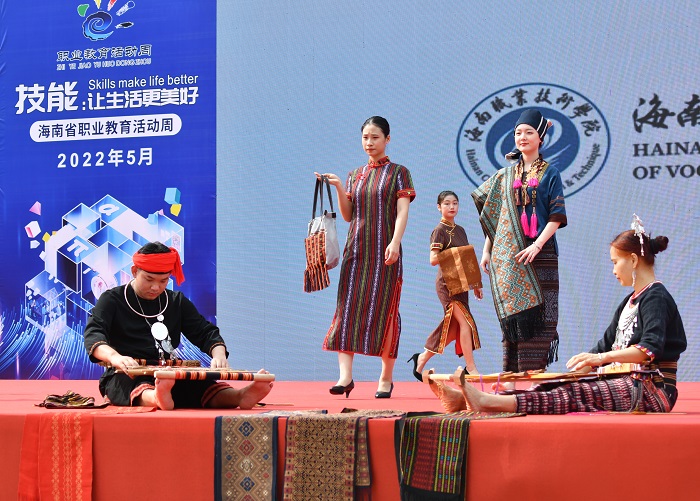 海職院培養(yǎng)的技藝傳承人展示黎族織錦技法(黨委宣傳部供稿)
