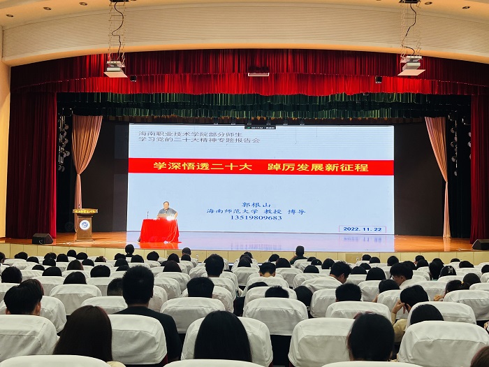 為深入推進(jìn)黨的二十大精神進(jìn)校園進(jìn)課堂進(jìn)頭腦,我校思想政治教學(xué)部于11月23日起舉行思政大講壇系列講座。首講邀請了海南師范大學(xué)教授、博士生導(dǎo)師郭根山,作主題為《學(xué)深悟透二十大  踔厲發(fā)展新征程》的講座。