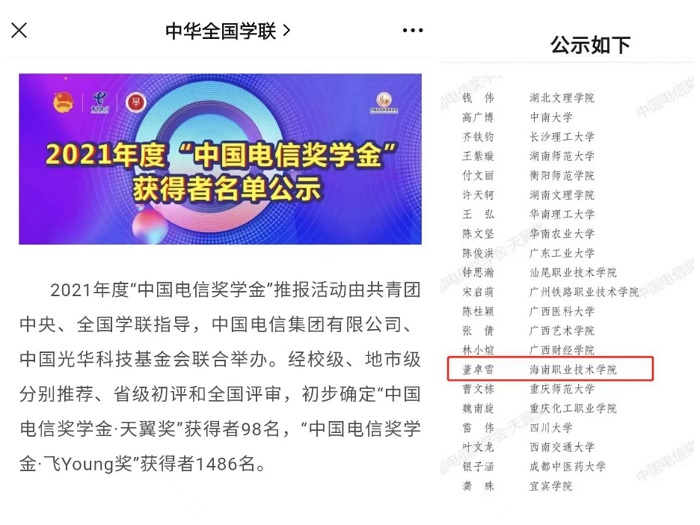 近日,由共青團(tuán)中央、全國(guó)學(xué)聯(lián)指導(dǎo),中國(guó)電信集團(tuán)有限公司、中國(guó)光華科技基金會(huì)聯(lián)合舉辦的2021年度“中國(guó)電信獎(jiǎng)學(xué)金”遴選活動(dòng)結(jié)果揭曉。經(jīng)校級(jí)、地市級(jí)分別推選、省級(jí)初評(píng)和全國(guó)評(píng)審等環(huán)節(jié),我校旅游學(xué)院董卓雪同學(xué)成功獲評(píng)2021年度“中國(guó)電信獎(jiǎng)學(xué)金·天翼獎(jiǎng)”。其中,“中國(guó)電信獎(jiǎng)學(xué)金•天翼獎(jiǎng)”是“中國(guó)電信獎(jiǎng)學(xué)金”的最高獎(jiǎng)項(xiàng),2021年度全國(guó)共遴選出98名獲獎(jiǎng)?wù)?,海南省僅有1名學(xué)生獲此殊榮。