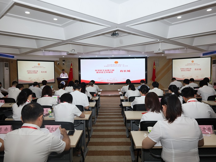 校工會負責(zé)人肖長城作了題為《高舉習(xí)近平新時代中國特色社會主義思想偉大旗幟,團結(jié)動員教職工為創(chuàng)建本科層次職業(yè)學(xué)校努力奮斗》的報告?!秷蟾妗房偨Y(jié)了近年來學(xué)校工會委員會在政治理論學(xué)習(xí)、民主建設(shè)管理工作、教職工權(quán)益保障工作、教職工問題組織工作等方面取得的創(chuàng)新成就,并對今后的工作提出建議。