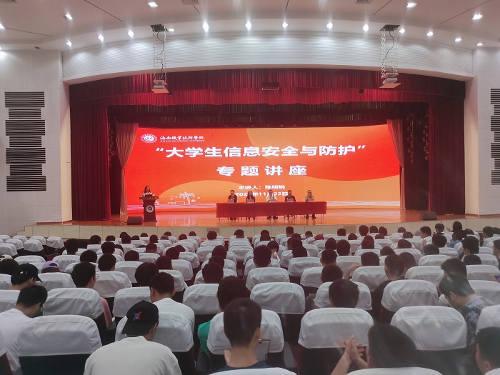 為深化學(xué)校信息安全教育工作,切實增強學(xué)生的信息安全意識,全面提升學(xué)生的自我保護和防范能力,11月22日上午,學(xué)校特邀請了海南省計算機學(xué)會理事長、海南大學(xué)信息科學(xué)技術(shù)學(xué)院創(chuàng)始副院長陳明銳教授作“大學(xué)生信息安全與防護”專題講座。