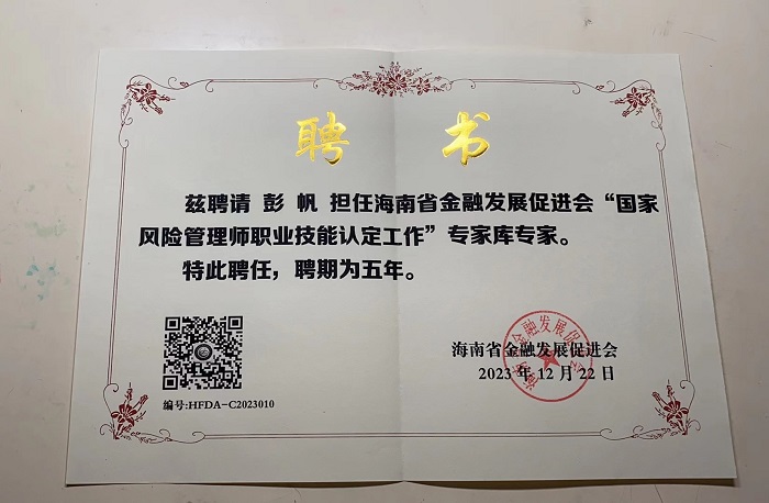 日前,經(jīng)海南省金融發(fā)展促進會擇優(yōu)遴選,我校經(jīng)濟管理學(xué)院陳惠芳、彭帆兩名老師成功入選為“國家風(fēng)險管理師職業(yè)技能認定工作”專家?guī)斓氖着诵某蓡T。同時,陳惠芳和彭帆兩位老師還成為海南省金融發(fā)展促進會的個人會員。