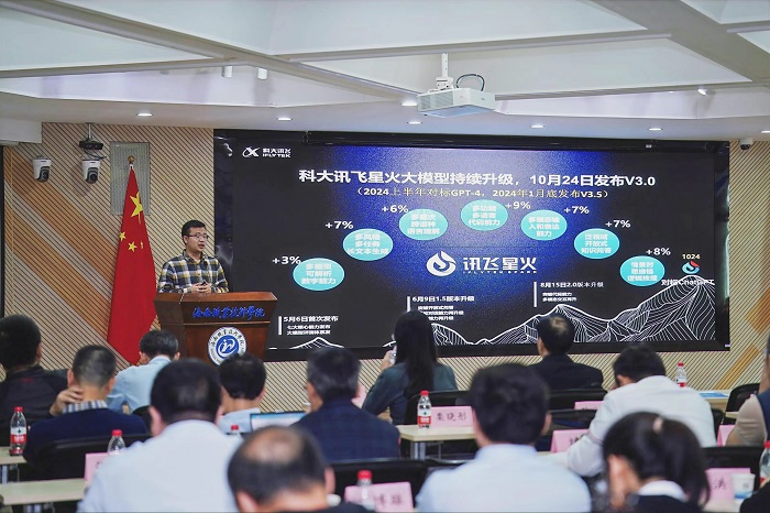科大訊飛股份有限公司認(rèn)知智能全國重點(diǎn)實(shí)驗(yàn)室智能教育中心賀勝研究員分享大模型領(lǐng)域話題(海職院供圖)