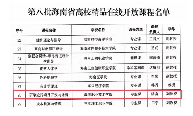 近日,海南省教育廳公布了第八批海南省精品在線開發(fā)課程名單,由我校旅游學(xué)院潘富副教授負(fù)責(zé)的《研學(xué)旅行項(xiàng)目開發(fā)與運(yùn)營》課程成功獲批。