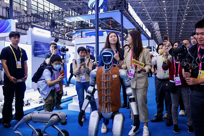 黎族傳統(tǒng)紡染織繡技藝(簡(jiǎn)稱黎錦技藝),作為海南省的國(guó)家級(jí)非遺瑰寶,于2024年12月5日成功從聯(lián)合國(guó)教科文組織急需保護(hù)的非物質(zhì)文化遺產(chǎn)名錄轉(zhuǎn)入人類非物質(zhì)文化遺產(chǎn)代表作名錄。為讓千年黎錦煥發(fā)時(shí)代生機(jī),海南職業(yè)技術(shù)學(xué)院從事非遺保護(hù)與創(chuàng)新應(yīng)用研究的師生聯(lián)合黎錦技藝傳承人組建設(shè)計(jì)制作團(tuán)隊(duì),深入黎族村落采風(fēng),提煉傳統(tǒng)紋樣,結(jié)合機(jī)器人、機(jī)器狗的動(dòng)態(tài)造型特點(diǎn),創(chuàng)新設(shè)計(jì)出黎錦“科技外衣”。展會(huì)期間,身著黎錦服飾的宇樹機(jī)器人、機(jī)器狗化身“文化大使”,在動(dòng)態(tài)演示中展示織錦紋樣的流動(dòng)之美,吸引大批觀眾駐足互動(dòng)。