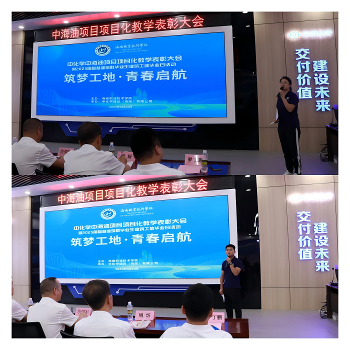 6月20日,工業(yè)與信息學(xué)院在中化學(xué)中海油深海能源開發(fā)總指揮部基地項目舉辦“項目化教學(xué)表彰大會暨智慧建筑群2025屆畢業(yè)生建筑工地畢業(yè)日活動”。中化學(xué)建設(shè)(海南)有限公司副總經(jīng)理助理李小平、海南職業(yè)技術(shù)學(xué)院教務(wù)處副處長李少敏、工業(yè)與信息學(xué)院副書記蔡慧敏出席活動。