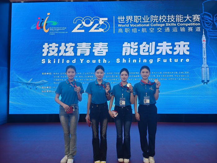 8月23日至27日,2025年世界職業(yè)院校技能大賽總決賽爭(zhēng)奪賽航空交通運(yùn)輸賽道高職組比賽在成都航空職業(yè)技術(shù)大學(xué)和四川航天職業(yè)技術(shù)學(xué)院成功舉辦。在我校旅游學(xué)院教師陳穎、胡佳佳悉心指導(dǎo)下,由空中乘務(wù)專(zhuān)業(yè)常瑞雪、許若萱、鄭欣瑤、朱忠婧四位同學(xué)組成的參賽隊(duì),從全國(guó)146支參賽隊(duì)伍中脫穎而出,斬獲大賽銀獎(jiǎng)。