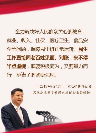 要著力保障民生建設(shè)資金投入,全力解決好人民群眾關(guān)心的教育、就業(yè)、收入、社保、醫(yī)療衛(wèi)生、食品安全等問(wèn)題,保障民生鏈正常運(yùn)轉(zhuǎn)。民生工作直接同老百姓見面、對(duì)賬,來(lái)不得半點(diǎn)虛假,既要積極而為,又要量力而行,承諾了的就要兌現(xiàn)。