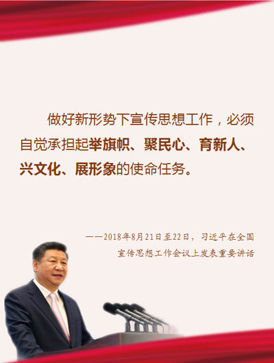 4、做好新形勢下宣傳思想工作,必須自覺承擔(dān)起舉旗幟、聚民心、育新人、興文化、展形象的使命任務(wù)。