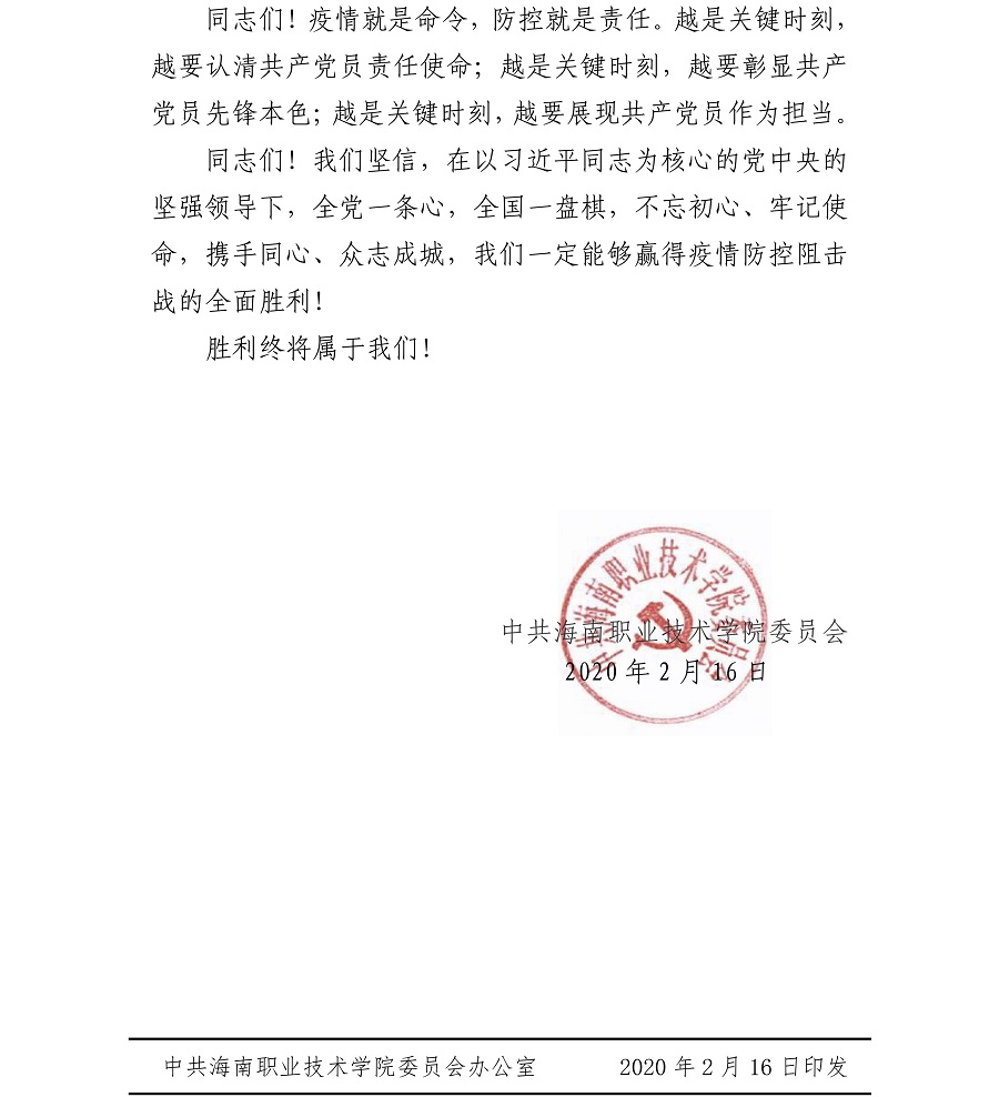 勝利終將屬于我們——中共海南職業(yè)技術(shù)學(xué)院委員會致全校各基層黨組織和全體黨員的倡議書