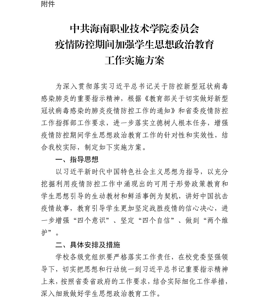 中共海南職業(yè)技術(shù)學(xué)院委員會(huì)關(guān)于印發(fā)《疫情防控期間加強(qiáng)學(xué)生思想政治教育工作實(shí)施方案》的通知