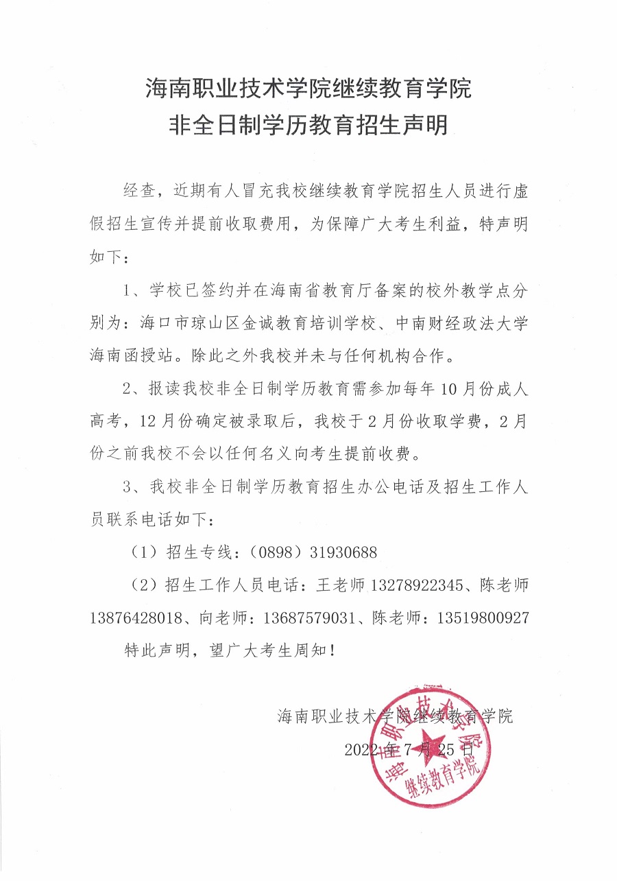 海南職業(yè)技術(shù)學院繼續(xù)教育學院非全日制學歷教育招生聲明