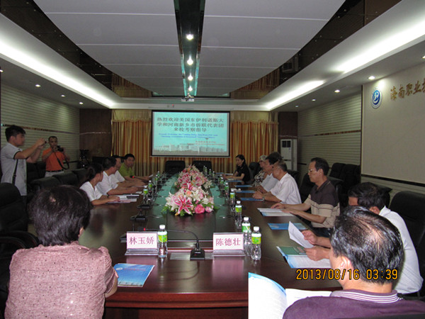 816,美國東伊利諾斯大學(xué)、河南新鄉(xiāng)市僑聯(lián)、??谑袃S聯(lián)代表團(tuán)到我??疾旖涣鞑⑸陶労献魇乱?。梁棟副校長、馬乃祥副校長在南山廳會(huì)見了客人。校辦部門負(fù)責(zé)人等參加了會(huì)談。