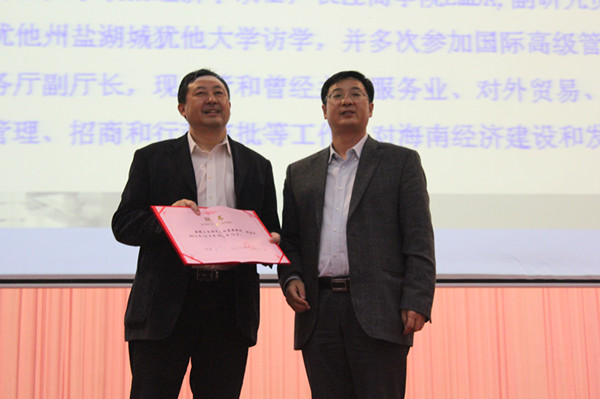1212,我校涉外商務管理學院舉辦主題講座,海南省商務廳王克強副廳長應邀到校主講了《關于海南服務業(yè)發(fā)展戰(zhàn)略的思考》。涉外商務管理學院全體教師及2012級、2013級學生參加。王安興代校長主持講座,并為王克強副廳長頒發(fā)海南職業(yè)技術學院客座教授聘書。