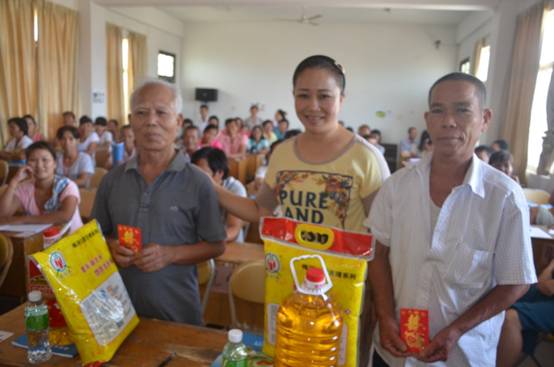 在活動(dòng)中,海職院第五支部書記高艷與玉下村黨支部書記覃才發(fā)分別介紹各自支部的情況,并且就如何開展好城鄉(xiāng)支部之間的交流活動(dòng)提出了好的看法和有效的建議;玉下村兩位老黨員向我校機(jī)關(guān)第五支部贈(zèng)送了“支部結(jié)對(duì)心相連,情系農(nóng)村促發(fā)展”的錦旗;海職院第五支部向玉下村兩位老黨員贈(zèng)送了慰問金和油、米等慰問品。