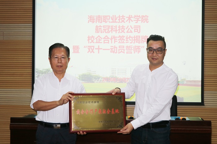 10月7日,我校與海南航冠電子科技有限公司舉行校企合作產(chǎn)教融合基地揭牌儀式。海南航冠電子科技有限公司總經(jīng)理許觀、項(xiàng)目運(yùn)營(yíng)總監(jiān)沈耀庭及我校校長(zhǎng)助理李琳娜出席揭牌儀式。