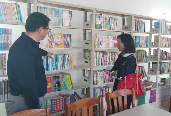 王安興一行參觀我校與新園村小學(xué)共建的圖書(shū)室(扶貧辦供圖)