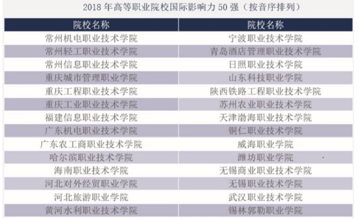 2018年全國(guó)高職院校國(guó)際影響力50強(qiáng)榜單