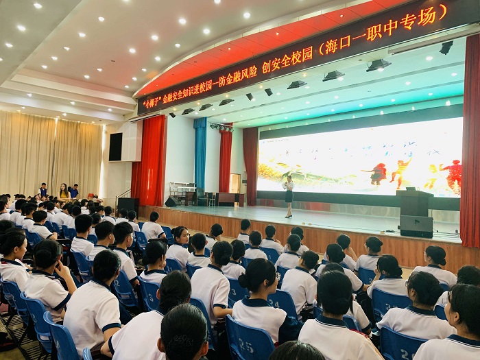 “小椰子”金融知識(shí)萬(wàn)里行志愿者在??谑械谝宦殬I(yè)中學(xué)宣講(經(jīng)管學(xué)院供圖)