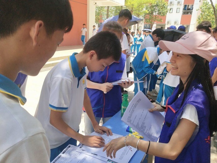“小椰子”金融知識(shí)萬(wàn)里行志愿者在海南省農(nóng)墾中學(xué)現(xiàn)場(chǎng)宣傳(經(jīng)管學(xué)院供圖)