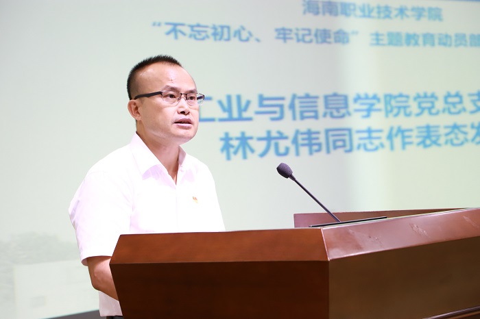 學(xué)校黨委副書(shū)記周炳才宣讀《海南職業(yè)技術(shù)學(xué)院“不忘初心、牢記使命”主題教育工作方案》。學(xué)校后勤黨總支書(shū)記高艷、工業(yè)與信息學(xué)院黨總支書(shū)記林尤偉代表全校黨員干部和各級(jí)黨組織在會(huì)上作表態(tài)發(fā)言。