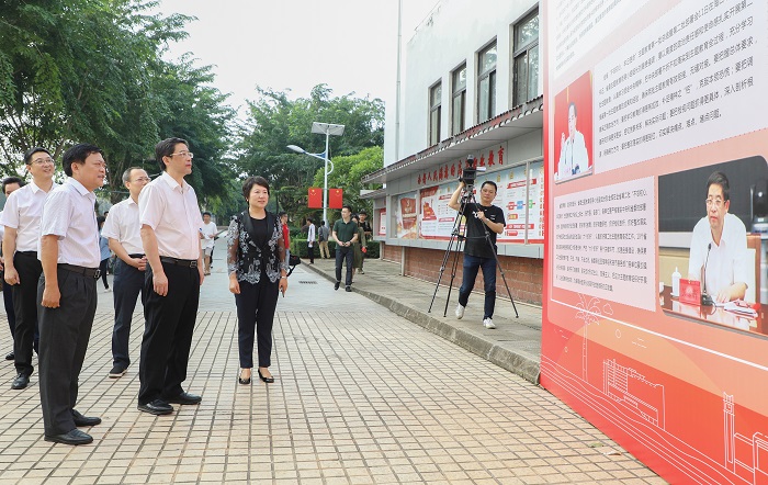 彭金輝觀看海職院“不忘初心、牢記使命”主題教育展板(黨委宣傳部供圖)