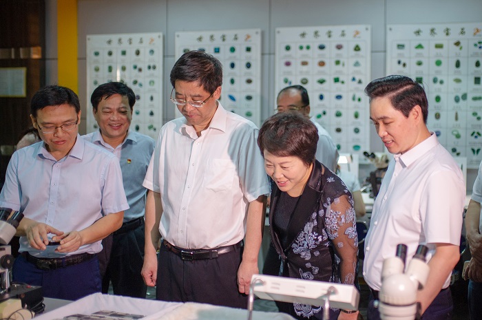 彭金輝觀看了海南職業(yè)技術(shù)學院發(fā)展概況和“不忘初心、牢記使命”主題教育展板,實地查看學校珠寶專業(yè)實訓中心,聽取學校主題教育開展情況和辦學成果匯報,充分肯定了學校主題教育取得的階段性成果和近20年以來辦學取得的成績,尤其是對學校主題教育學深悟透、扎實整改和學校連續(xù)三屆獲得國家級教學成果獎給予了高度贊賞。