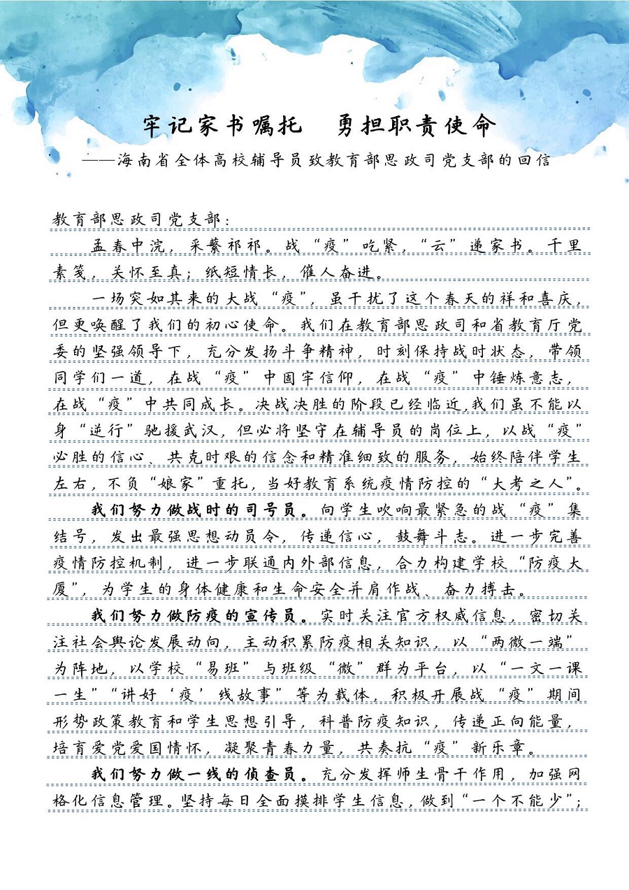 牢記家書囑托 勇?lián)氊熓姑D鲜∪w高校輔導員致教育部思政司黨支部的回信