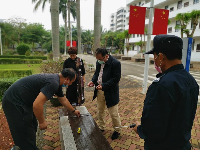 4月4日,是清明假期的第一天,后勤保衛(wèi)處保衛(wèi)科科長(zhǎng)李國(guó)建帶領(lǐng)保衛(wèi)科的隊(duì)員們,自發(fā)組成維修隊(duì),義務(wù)維修了校友為學(xué)校捐贈(zèng)的50把石凳。